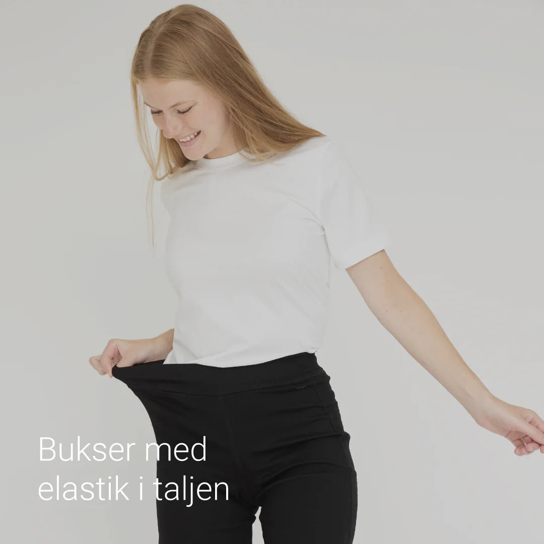 Hos LAURIE tilbyder vi et stort udvalg af bukser med elastik i taljen. Vi lægger nemlig stor vægt på netop komfort, bevægelsesfrihed og fleksibilitet, og derfor finder du naturligvis også bukser med elastisk linning som en stor del af vores faste sortiment. I øvrigt kan du også være sikker på, at der er masser af stræk i alle vores bukser, uanset hvilken model, du vælger.