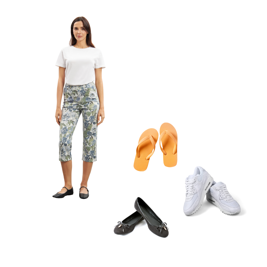 Valget af fodtøj spiller en stor rolle for, hvordan dine capri bukser tager sig ud. Da bukserne er relativt korte, er det en god idé at vælge sko, der fremhæver dine ankler for at skabe balance i din styling. Flade sko som sandaler eller sneakers giver et afslappet look, der er perfekt til en afslappet sommerdag. Hvis du ønsker et mere sofistikeret udtryk, kan høje hæle være et fantastisk valg. Høje hæle giver både elegance og får dine ben til at se længere ud. Capri bukser er velegnede til både høje og lave kvinder – for dem med kortere ben kan bukserne give en følelse af at have længere ben, især når de kombineres med hæle.