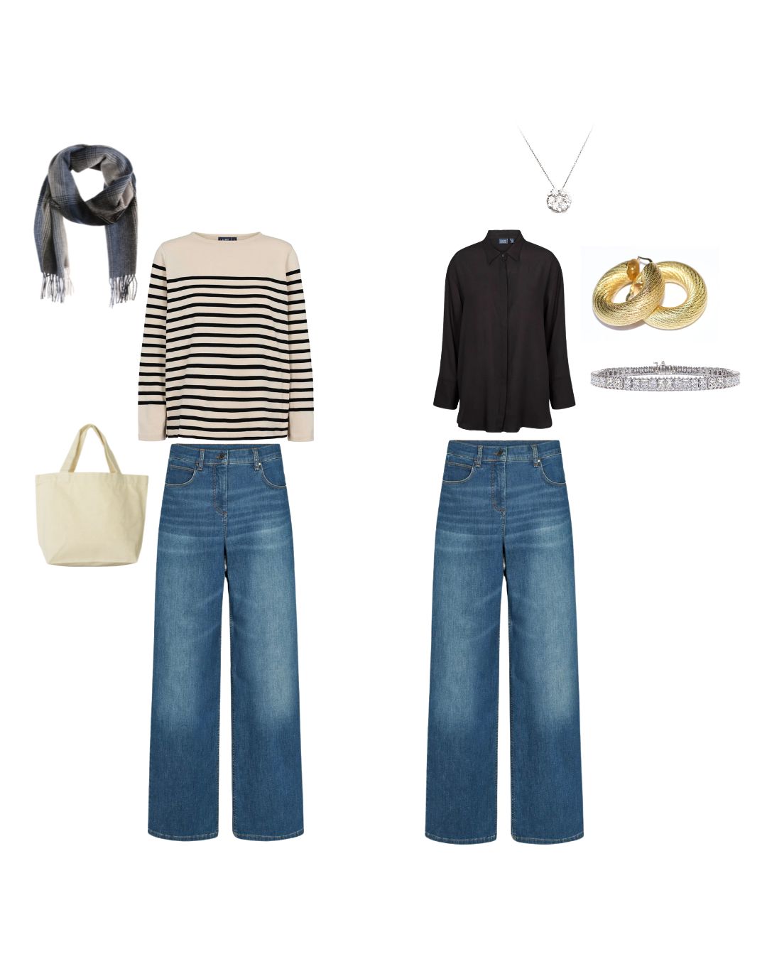 eller løse cowboybukser et ekstra touch. Tilføj smarte øreringe, der fanger lyset, en elegant taske, og skift måske til et par høje hæle for en sofistikeret fornemmelse. Du kan også eksperimentere med en stor halskæde eller flere fine ringe for et moderne touch. Hvis du vil tage det til næste niveau, kan et bælte med en smuk detalje