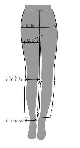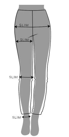 Slim pasformen følger kroppens form, og giver et slankt udtryk ned langs benet. Slim bukser har en bredere udformning ved anklerne end Skinny.